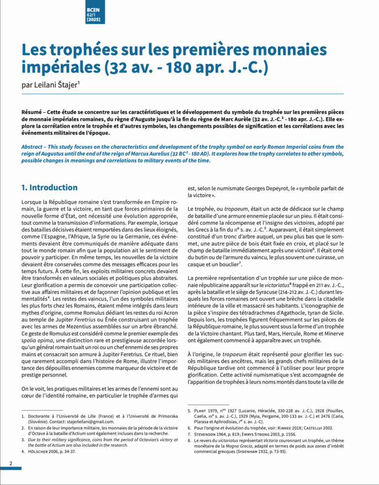 Članek obravnava pojav in razvoj simbola trofeje na rimskih imperialnih novcih od Avgusta do Marka Avrelija (32 pr. n. š. – 180 n. š.). Proučuje vizualne značilnosti trofej, njihovo povezavo z drugimi motivi ter možne pomenske premike v odnosu do vojaških dogodkov tistega časa. Raziskava tako osvetljuje ikonografske strategije rimskega imperija v obdobju zgodnjega principata.
