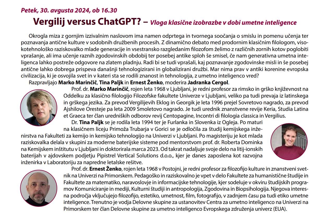 Z dinamično debato med prodornim klasičnim filologom, visokotehnološko raziskovalko mlade generacije in vsestransko razgledanim filozofom želijo z različnih zornih kotov poglobiti vprašanje, ali ima učenje raznih zgodovinskih obdobij ter posebej antike sploh še smisel, če nam generativna umetna inteligenca lahko postreže odgovore na zlatem pladnju. Vprašali se bodo, kaj poznavanje zgodovinske misli in še posebej antične lahko dobrega prispeva današnji tehnologizirani in globalizirani družbi. Mar nima prav v antiki korenine evropska civilizacija, ki je osvojila svet in v kateri sta se rodili znanost in tehnologija, z umetno inteligenco vred?
