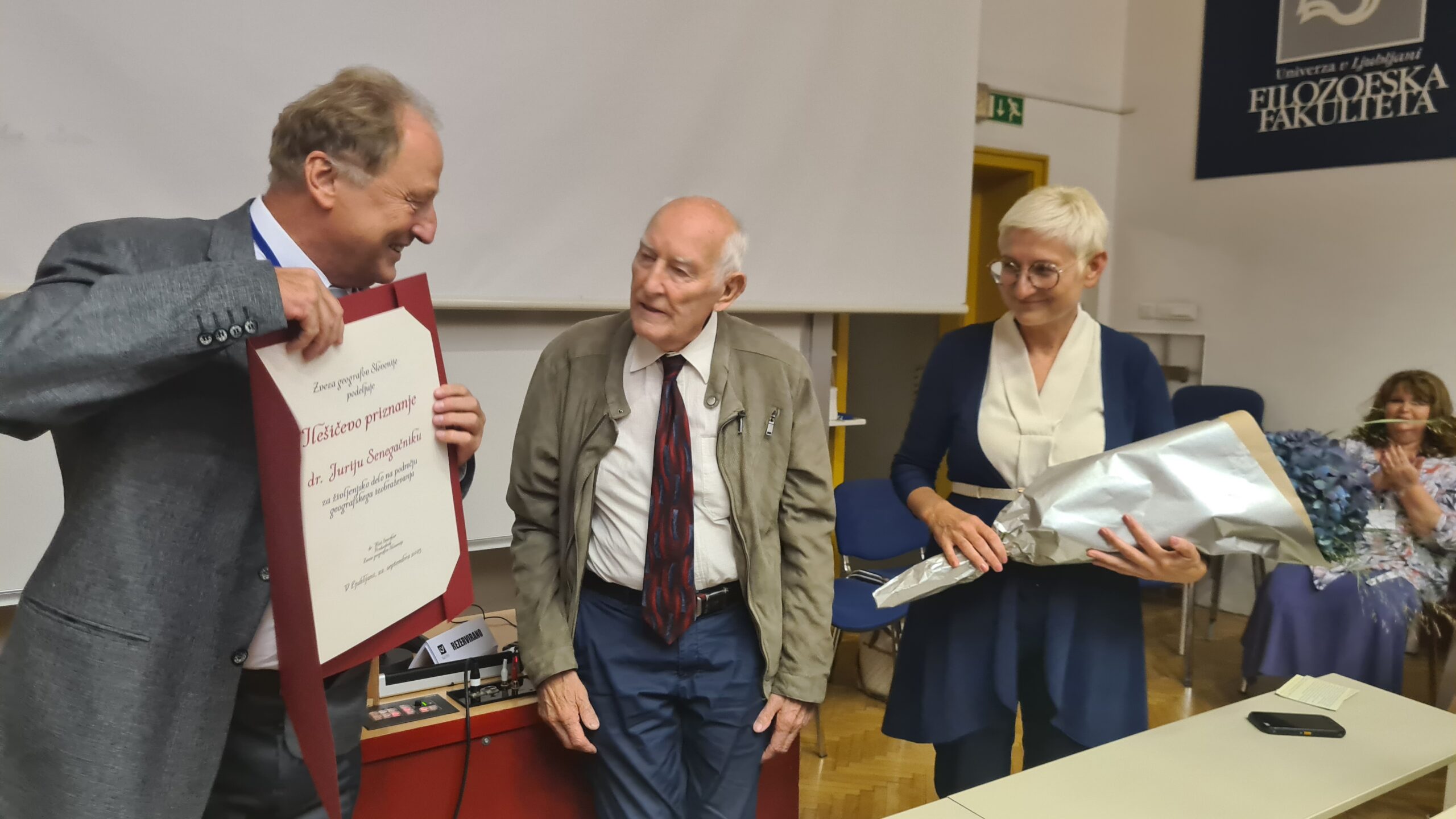 Slika 1: Prejemnik Ilešičevega priznanja Zveze geografov Slovenije, doc. dr. Jurij Senegačnik, prejema čestitke od zaslužnega profesorja dr. Jurija Kunaverja in dr. Mimi Urbanc (foto: dr. Katja Vintar Mally)