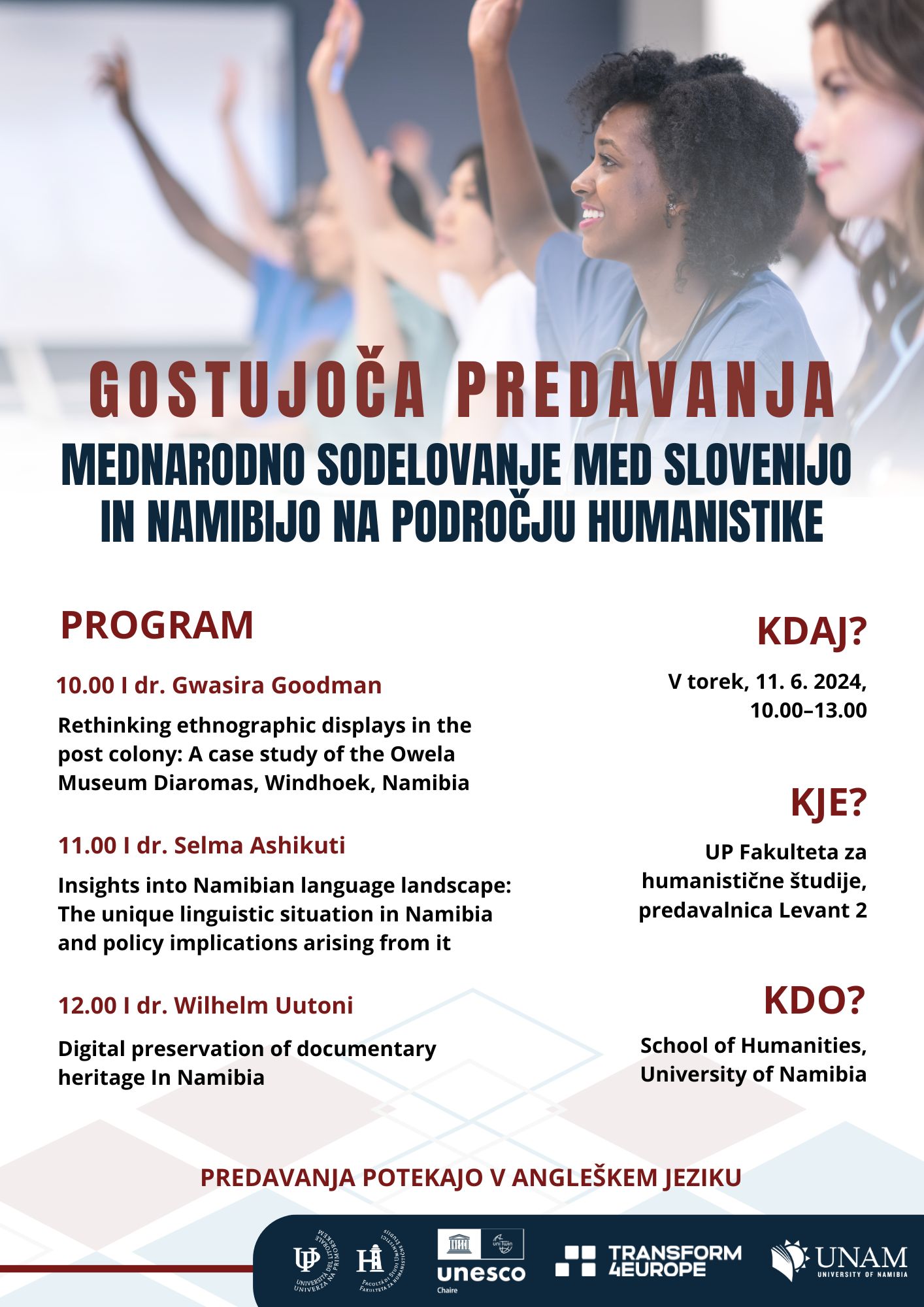 Nadaljevala bo dr. Selma Ashikuti s predavanjem o namibijski jezikovni pokrajini, edinstveni jezikovni situaciji v Namibiji in političnih posledicah, ki izhajajo iz tega. Sicer je zaposlena kot lektorica in raziskovalka na področju jezikoslovja na Oddelku za humanistiko in umetnost na Fakulteti za humanistiko.