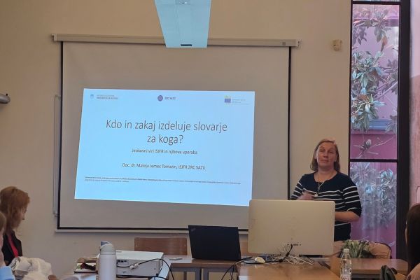 Na Oddelku za slovenistiko smo v torek, 9. decembra, gostili vodjo Jezikovnotehnološkega razvojnega centra na Inštitutu za slovenski jezik Frana Ramovša in raziskovalko na Oddelku za terminologijo dr. Matejo Jemec Tomazin. V predavanju se je osredotočila na vlogo terminoloških portalov v pedagoškem procesu. Predstavila je slovarski portal Fran, različne tipe slovarjev, ki so na njem dostopni, Jezikovno in Terminološko svetovalnico ter druge publikacije in zbirke, ki jih pripravlja Inštitut za slovenski jezik Frana Ramovša.