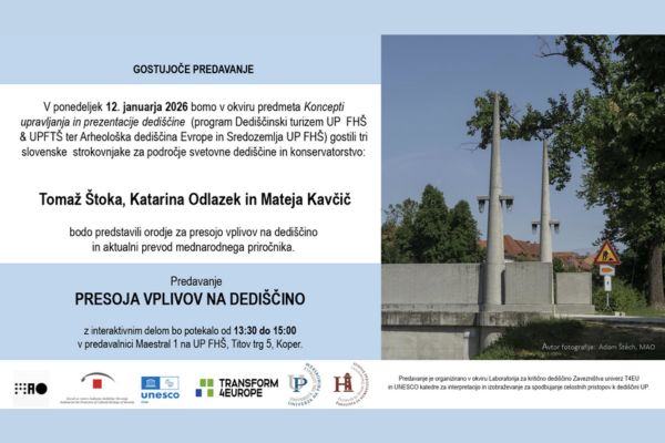 V ponedeljek 12. januarja 2026 bomo v okviru predmeta Koncepti upravljanja in prezentacije dediščine (program Dediščinski turizem UP FHŠ & UPFTŠ ter Arheološka dediščina Evrope in Sredozemlja UP FHŠ) gostili tri slovenske strokovnjake za področje svetovne dediščine in konservatorstvo. Tomaž Štoka, Katarina Odlazek in Mateja Kavčič bodo predstavili orodje za presojo vplivov na dediščino in aktualni prevod mednarodnega priročnika. Predavanje PRESOJA VPLIVOV NA DEDIŠČINO z interaktivnim delom bo potekalo od 13:30 do 15:00