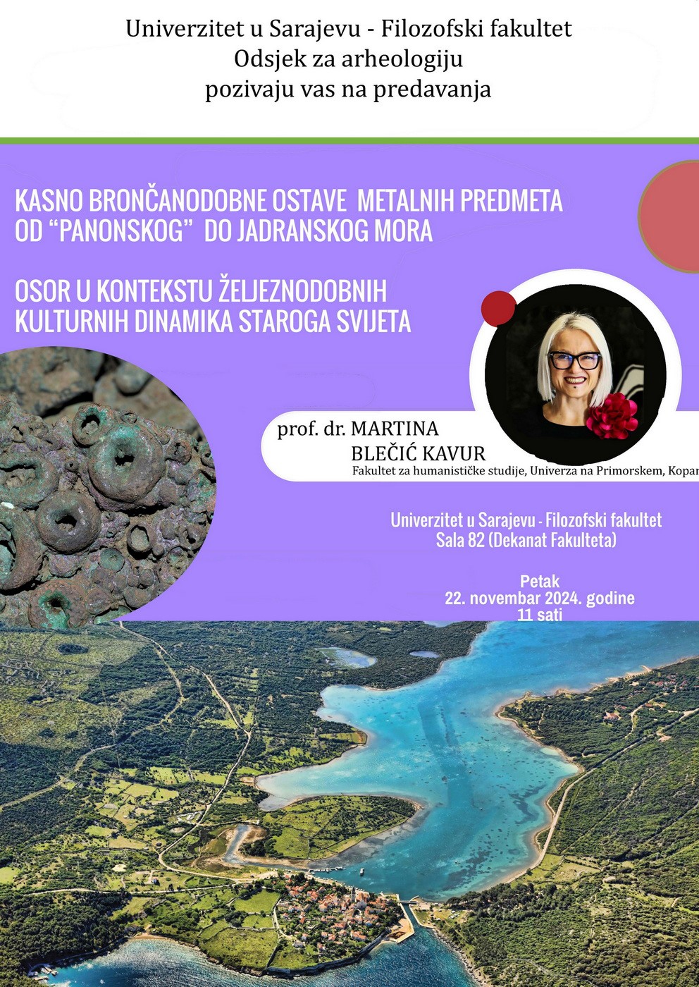 Predavateljica je gostovala na Oddelku za arheologijo in na Oddelku za zgodovino, in sicer za prvo in drugo stopnjo študija pri predmetih, ki jih vodita prof. dr. Adnan Busuladžić in izr. prof. dr. Amra Šačić Beća. V predavanju, ki ga je naslovila Kasno brončanodobne ostave metalnih predmeta od »Panonskog« do Jadranskog mora, je študentom arheologije in zgodovine predstavila nove rezultate svojih raziskav v okviru aktivnosti mednarodnega projekta Od mora do morja: Kontinuiteta in spremembe med bronasto in železno dobo na ozemlju med Jadranom in Panonsko nižino. Poseben poudarek je bil na vrednotenju depojskih in posameznih kovinskih najdb na območju severnega Jadrana in njegovega zaledja v družbenem in ideološkem konceptu, na osnovi interdisciplinarnih raziskav kroženja predmetov, surovin in tehnologij.