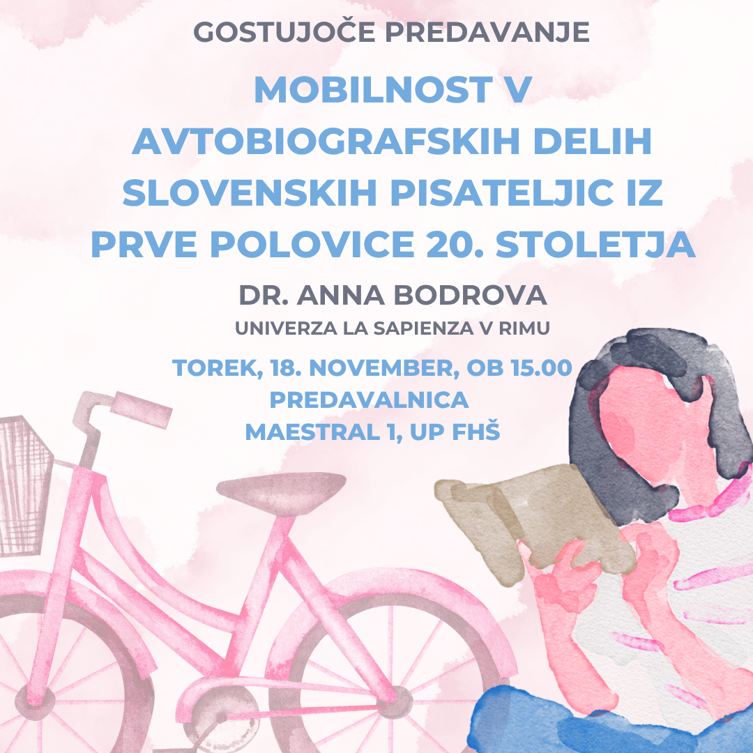 z veseljem vas vabimo na gostujoče predavanje naše kolegice dr. Anne Bodrove, izredne profesorice za slovenski jezik in književnost na rimski univerzi La Sapienza, na temo Mobilnost v avtobiografskih delih slovenskih pisateljic iz prve polovice 20. stoletja.