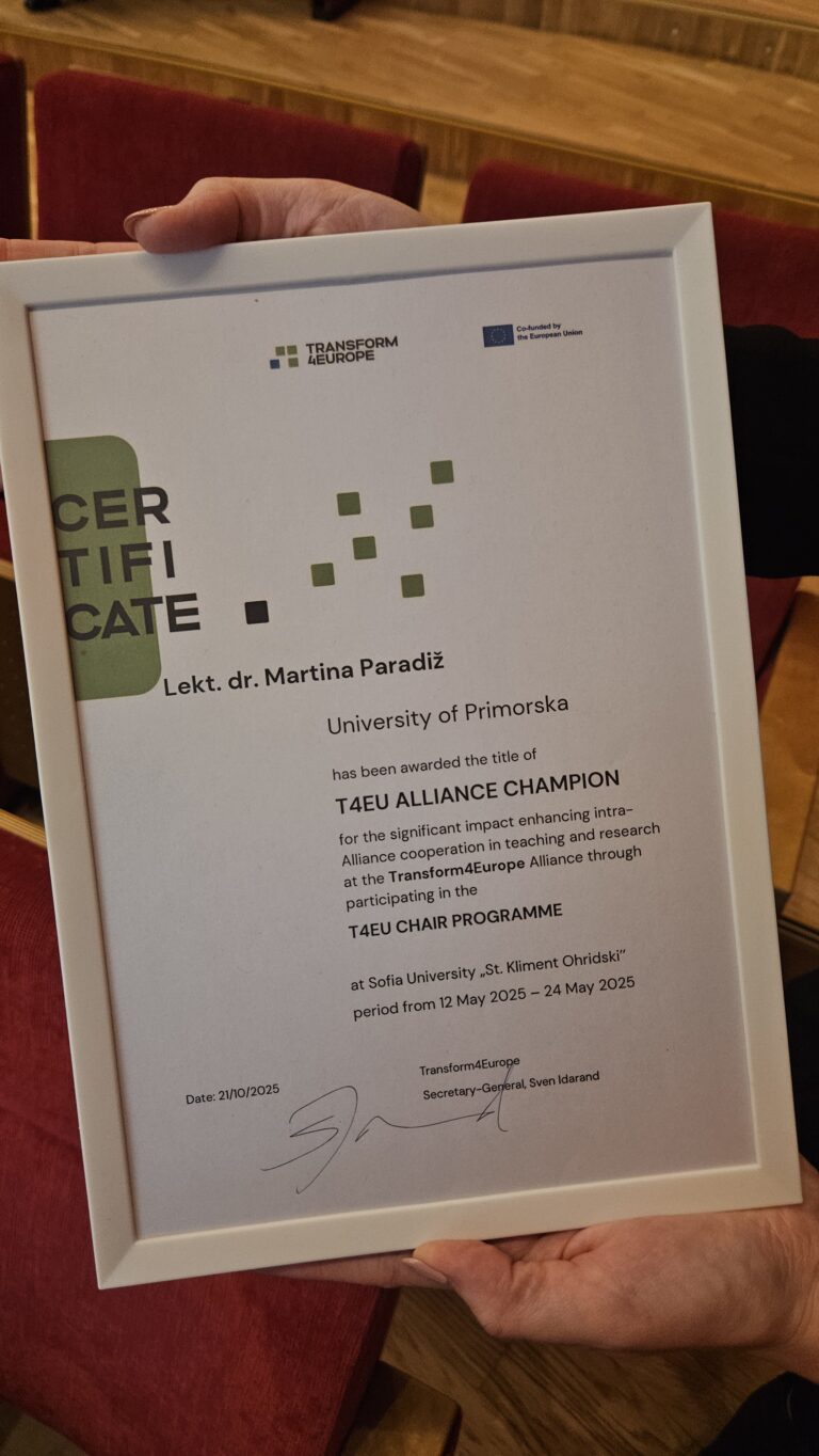 Nagrado je prejela lekt. dr. Martina Paradiž, ki je bila v drugem semestru 2024/2025 gostujoča profesorica na T4EU partnerski Univerzi St. Kliment Ohridski v Sofiji (Bolgarija).