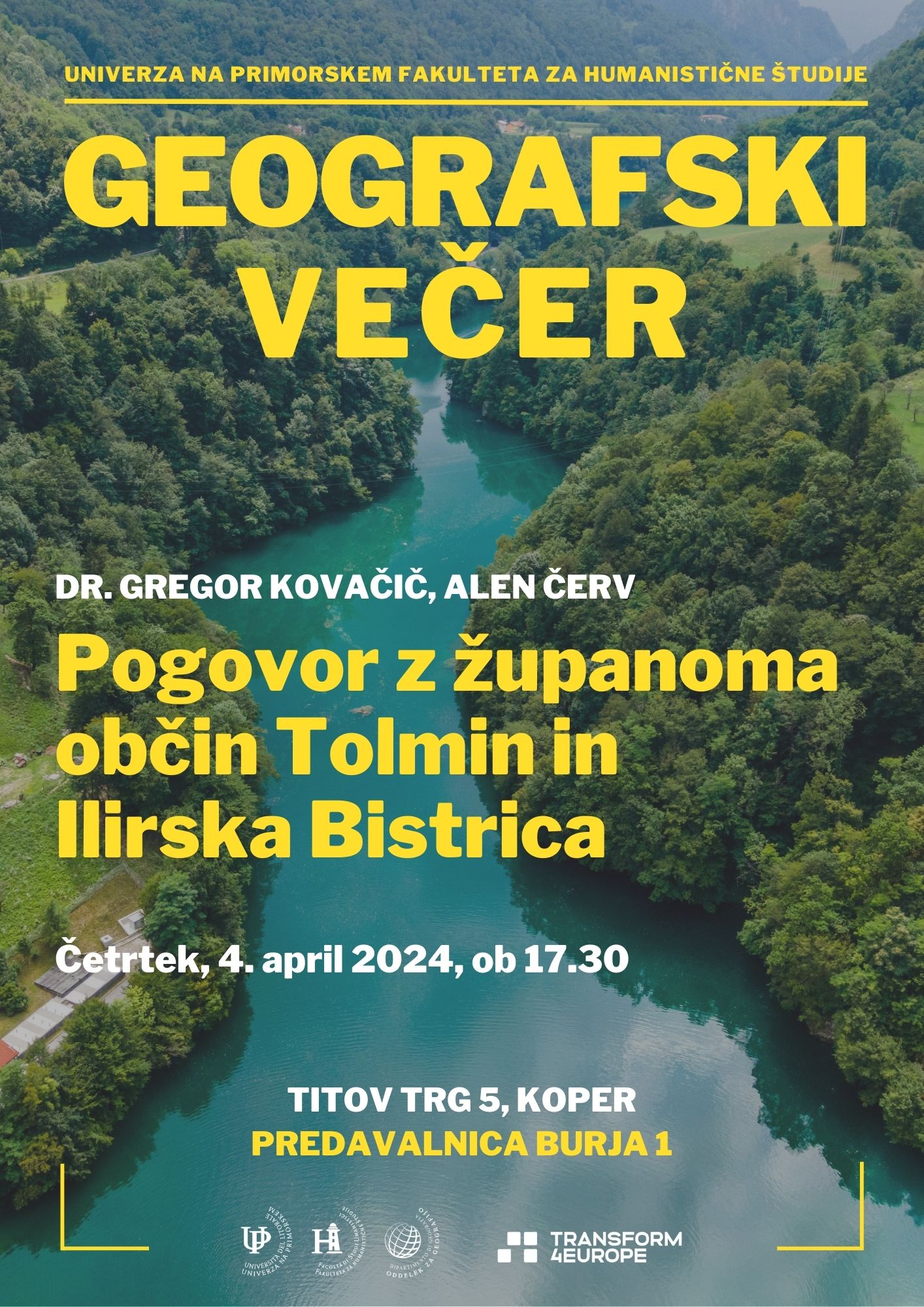 4. 4. 2024 – Pogovor z Alenom Červom, županom občine Tolmin, in dr. Gregorjem Kovačičem, županom občine Ilirska Bistrica. Pogovor je moderiral doc. dr. Janez Nared z Oddelka za geografijo UP FHŠ in Geografskega inštituta Antona Melika ZRC SAZU. >> VEČ O DOGODKU