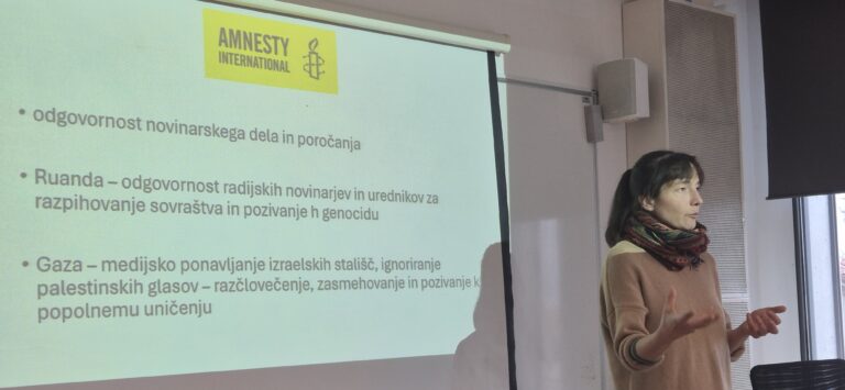 V osrednjem delu dogodka je bila predstavljena mednarodna organizacija Amnesty International, s poudarkom na delovanju Amnesty International Slovenije. Predstavnica organizacije Kristina Božič je spregovorila o delovanju v kriznih razmerah, spremljanju in preverjanju kršitev človekovih pravic na terenu, izzivih sodobnega družbeno-političnega okolja ter o pomenu neodvisnega civilnodružbenega delovanja za zaščito človekovega dostojanstva v času kriz. Ogledali pa smo si tudi desetminutni promocijski film o aktivni vlogi in pomoči omenjene organizacije v različnih svetovnih kriznih žariščih.