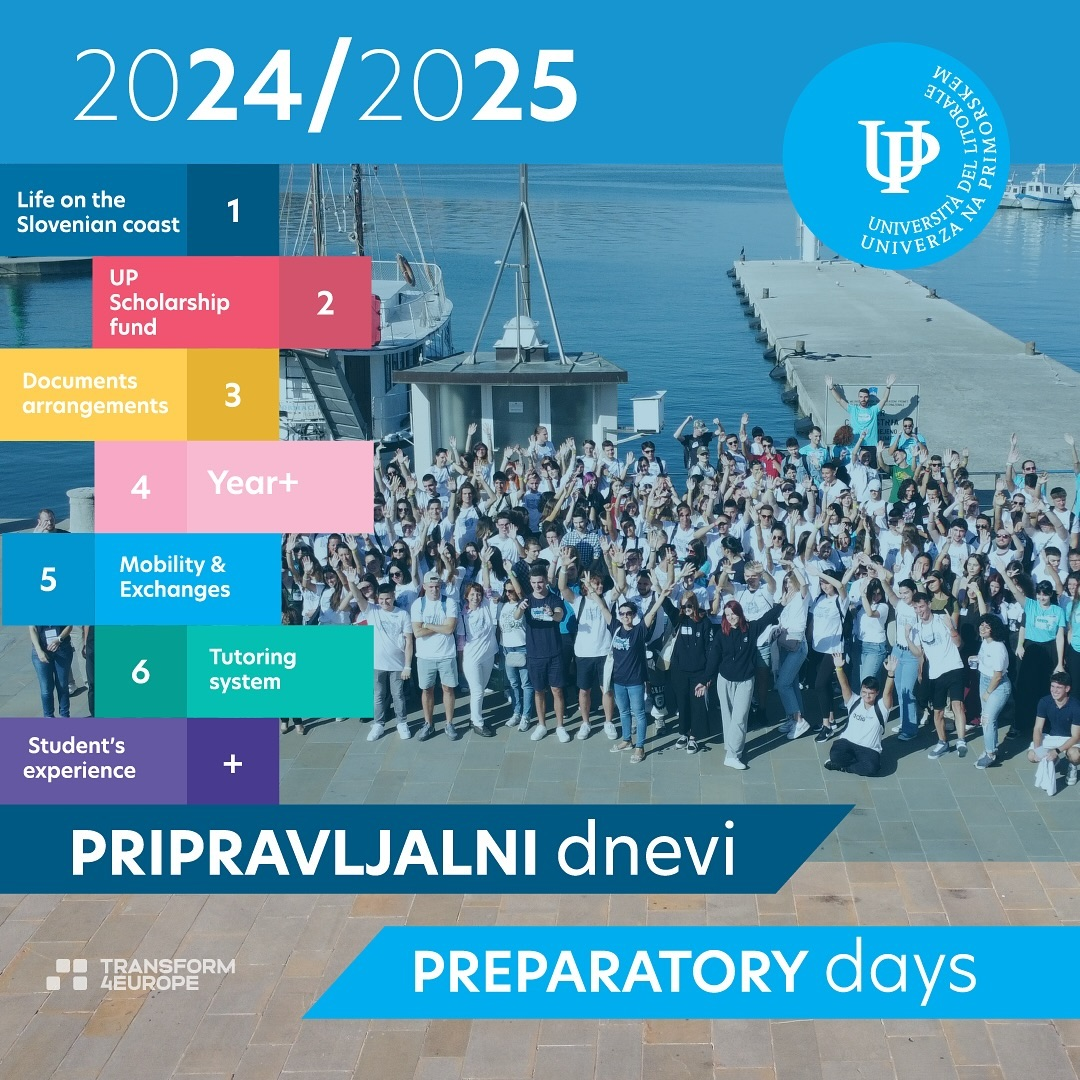 Med 9. in 20. septembrom na Univerzi na Primorskem potekajo Pripravljalni dnevi za vse tuje študente, ki bodo s 1. oktobrom postali študentje UP. V dveh tednih bodo študentje spoznavali okolje, v katerega prihajajo, kulturo, univerzo, njene fakultete in priložnosti, ki se jim bodo ponujale. Da bi se bolj povezali z novim okoljem, bodo obiskovali tudi 30-urni spletni tečaj slovenščine SpeakUP Slovene. Strokovne službe jim bodo pomagale pri pripravi dokumentacije za pridobivanje dovoljenja za začasno prebivanje, v tem času pa bodo tudi spoznali sedanje mednarodne študente UP, ki bodo delili svoje izkušnje.