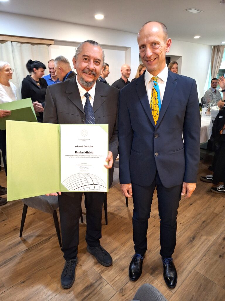 Posebno priznanje »Častni član Zveze geografov Slovenije« je na simpoziju prejel prof. dr. Ranko Mirić z Oddelka za geografijo Naravoslovno-matematične fakultete Univerze v Sarajevu. Profesor Mirić je bil nagrajen za prispevek k razvoju mednarodnega sodelovanja in povezovanja slovenskih in bosansko-hercegovskih geografov, pri pripravi pobude in utemeljitvi vloge za nagrado pa je sodeloval tudi Oddelek za geografijo UP FHŠ. Vsem dobitnikom priznanj iskreno čestitamo.