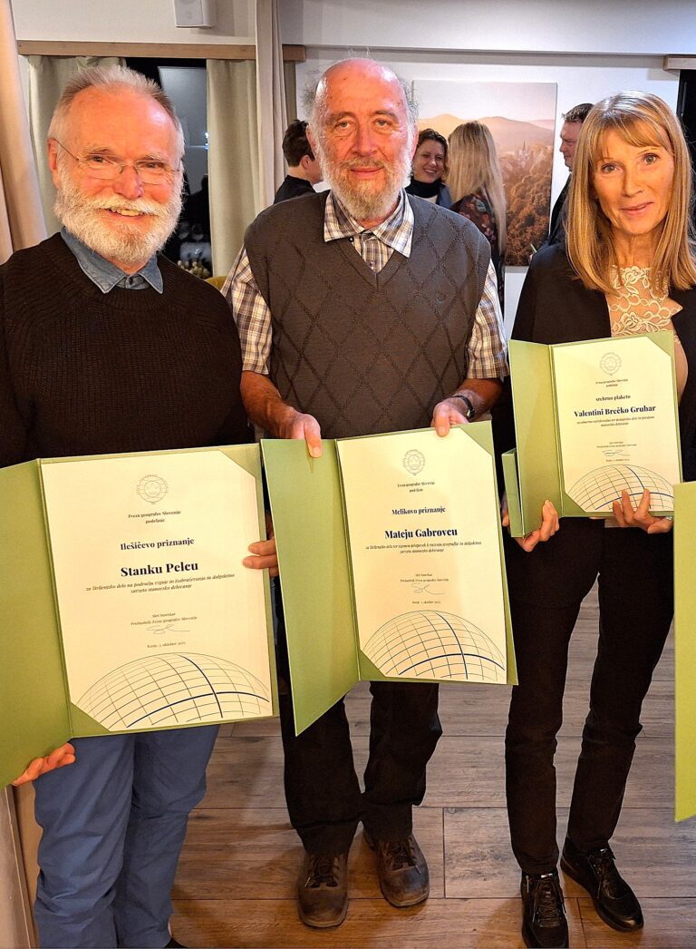 Zveze geografov Slovenije je na simpoziju podelila stanovske nagrade za vidne dosežke na področju geografije. Med letošnjimi prejemniki priznanj so bili tudi trije sodelavci Oddelka za geografijo UP FHŠ, ki so bili nagrajeni za svoje dolgoletno predano pedagoško in znanstveno delo. Srebrno plaketo Zveze geografov Slovenije za odmevno raziskovalno in pedagoško delo ter dolgoletno stanovsko delovanje je prejela izr. prof. dr. Valentina Brečko Grubar, izr. prof. dr. Stanko Pelc je prejel Ilešičevo priznanje za življenjsko delo na področju vzgoje in izobraževanja, dolgoletni zunanji sodelavec oddelka, doc. dr. Matej Gabrovec, pa je bil nagrajen z Melikovim priznanjem za življenjsko delo, dolgoletno stanovsko delovanje ter izjemen prispevek k razvoju geografije.