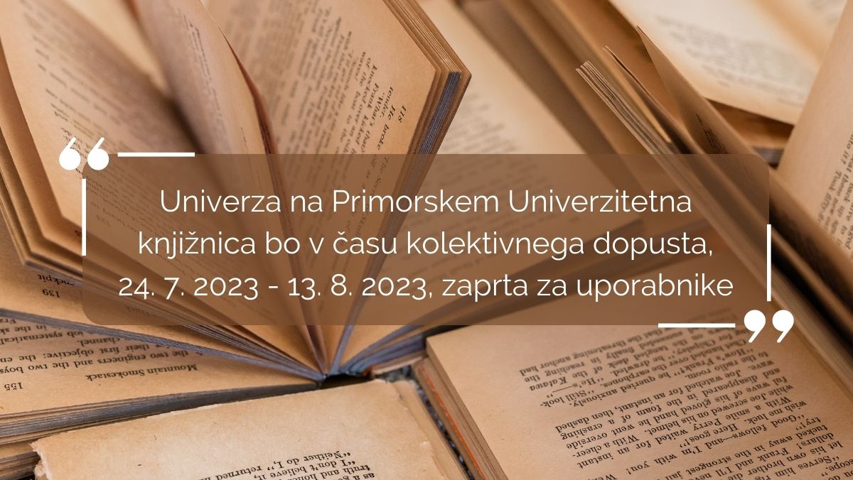 Obveščamo vas, da bo Univerza na Primorskem Univerzitetna knjižnica v času kolektivnega dopusta od 24. 7. 2023 – 13. 8. 2023, zaprta za uporabnike. Obe enoti bosta svoja vrata ponovno odprli v ponedeljek, 14. avgusta.