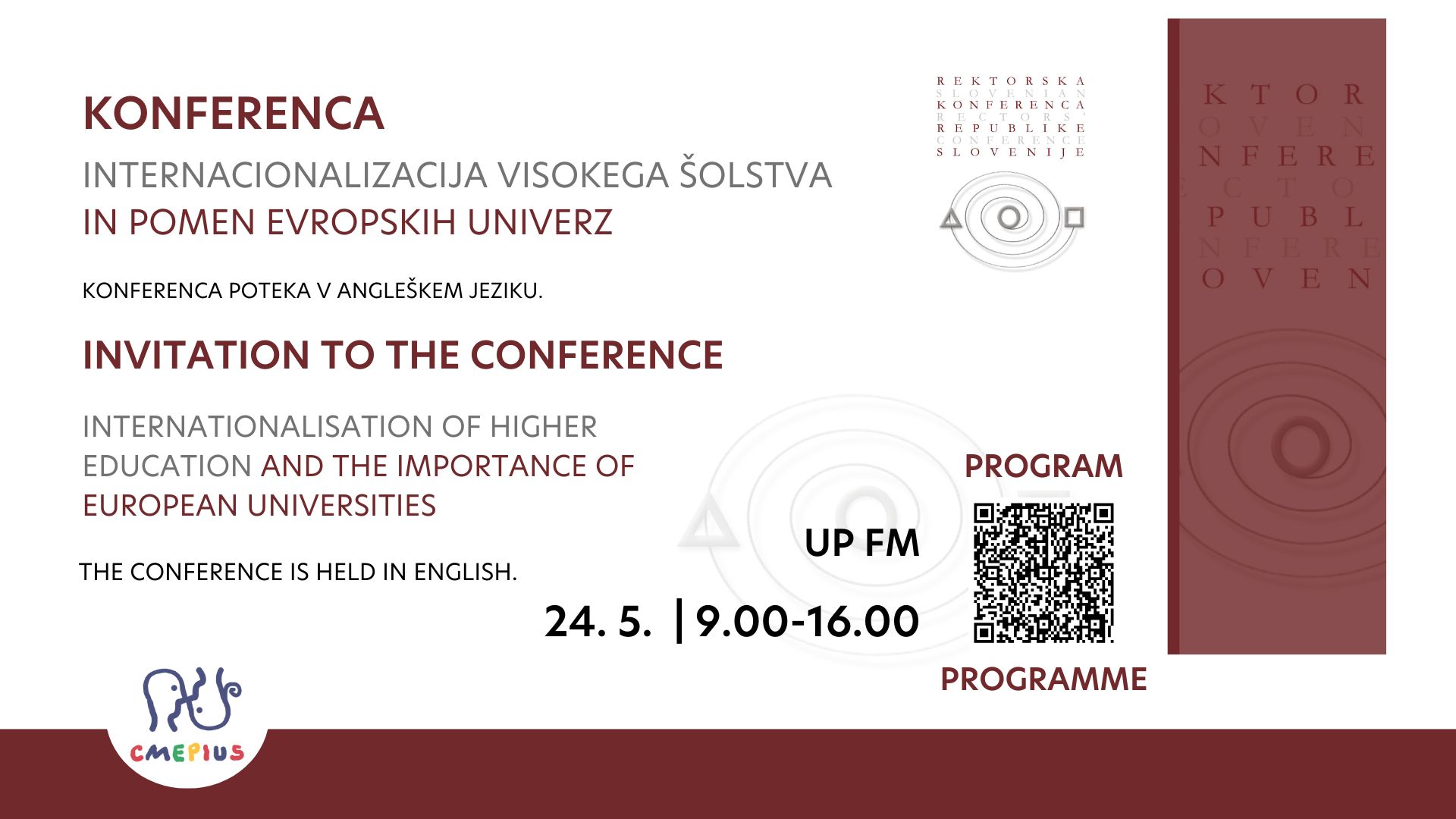 Konferenca ja namenjena razpravi in izmenjavi izkušenj, dobrih praks ter izzivov med slovenskimi univerzami, ki sodelujejo v zavezništvih evropskih univerz. Poudarek bo na profesionalnem razvoju in krepitvi kompetenc osebja preko strateško umeščenih mednarodnih mobilnosti, ki so eden od ključnih elementov zavezništva ter kako se to vključuje v razvoj institucije, dvig kakovosti poučevanja in raziskovanja. Udeleženci bodo na dogodku imeli priložnost slišati poglede vodstev slovenskih univerz, vključenih v zavezništvo, ter se seznaniti s primeri dobrih praks z omenjenega področja.